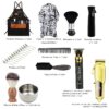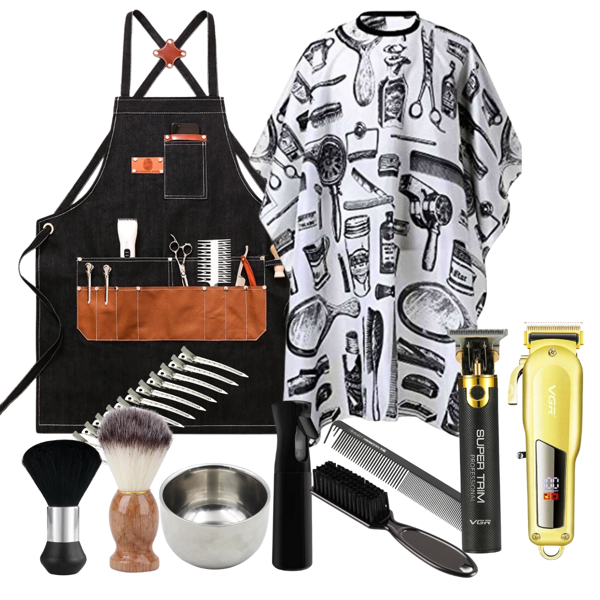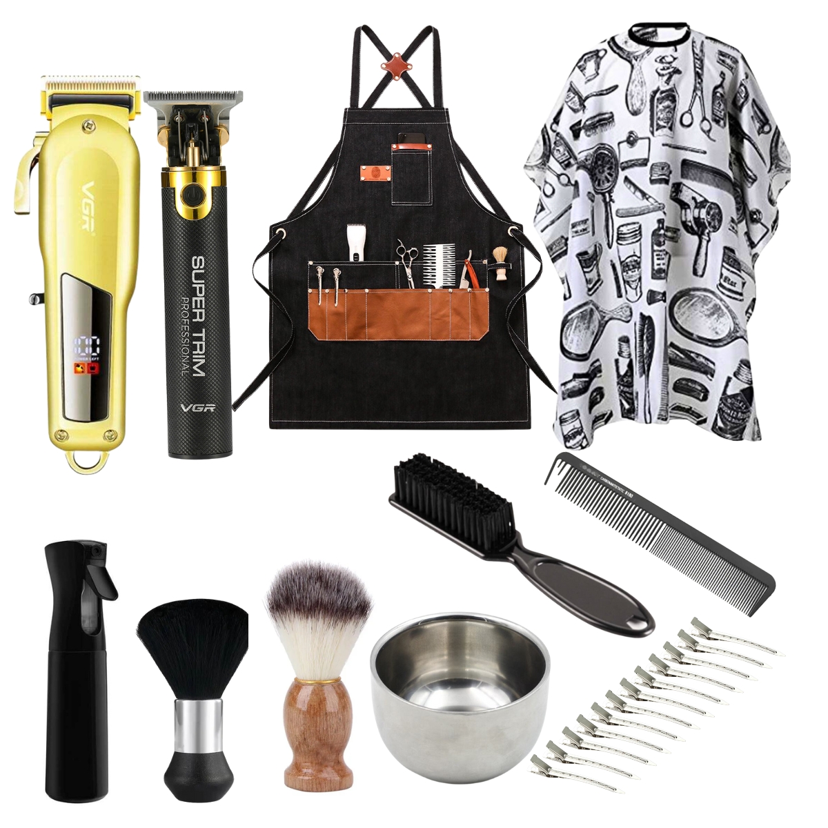 Transforma tu barbería con nuestro Kit Barbero Profesional. Incluye máquinas cortadoras y trimmers de precisión, capa y delantal elegantes, pulverizador, pinzas, peineta y bota para pelos. Este conjunto completo garantiza un servicio excepcional y eficiente. Con herramientas de alta calidad y diseño ergonómico, este kit ofrece comodidad y resultados de nivel profesional. Impresiona a tus clientes con un afeitado y corte de cabello impecables. Eleva tu reputación como barbero de élite con este kit que cumple con los estándares más exigentes de la industria.