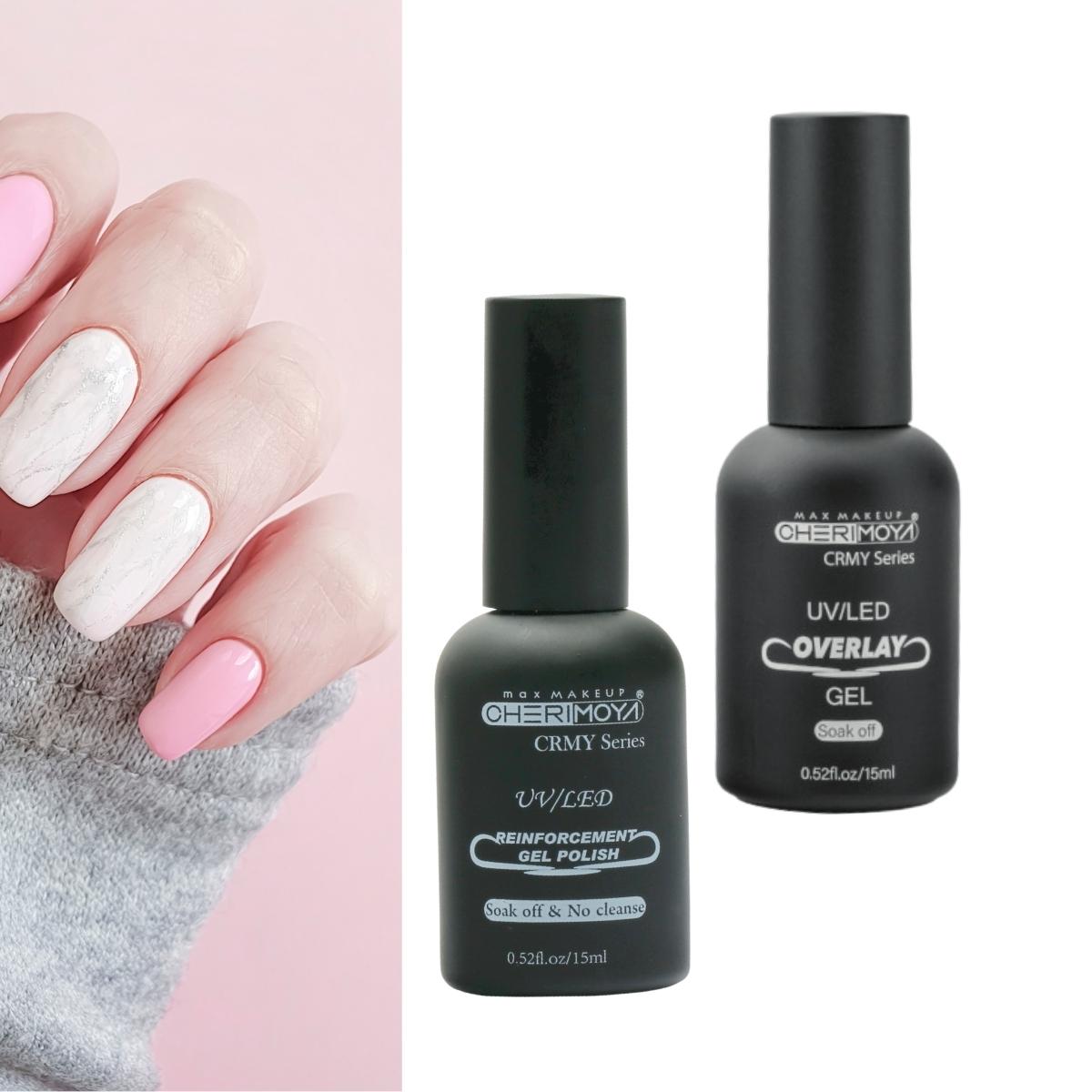 Kit Gel Reinforcement y Base Alargadora Overload Adherente. Las ventajas de este kit es que te da fortaleza a las uñas y que puedes llevarlas con o sin esmalte y se ven igual de hermosas por el brillo, luciendo unas uñas a la moda, evitando grietas y astilladuras.