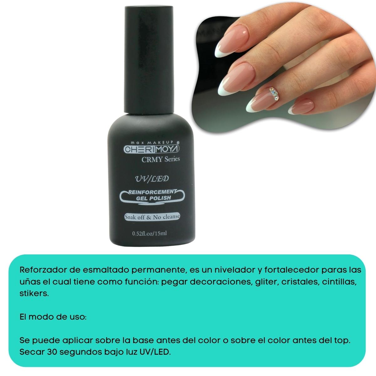 º REINFORCEMENT: Ayuda a reforzar y nivelar el esmaltado permanente, previene las grietas de las uñas, sirve para encapsular decoraciones como glitters, stickers y pegar cristales, además es ideal para realizar la Técnica de Kapping, sobre uñas débiles y escamadas.