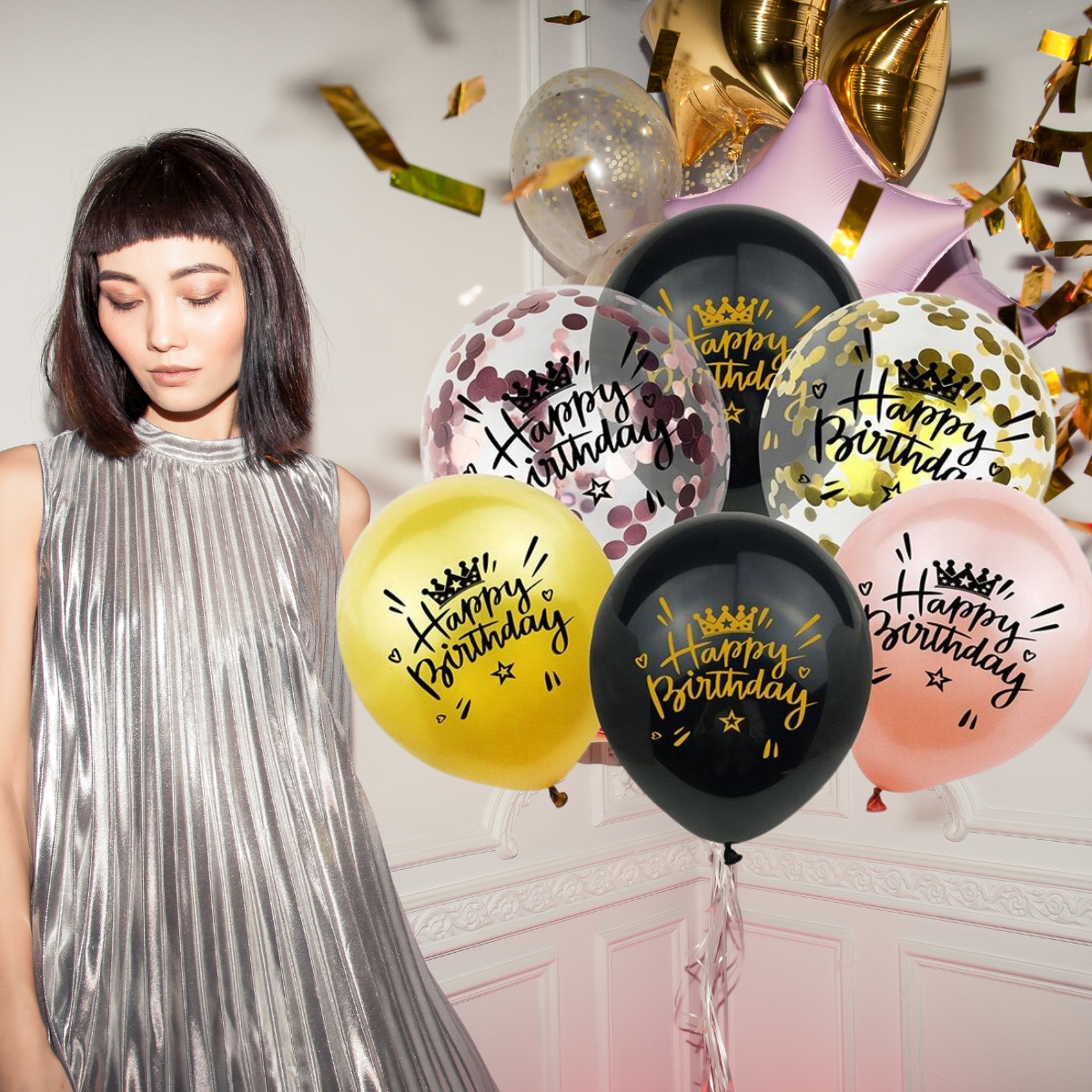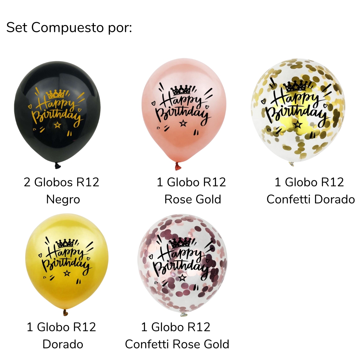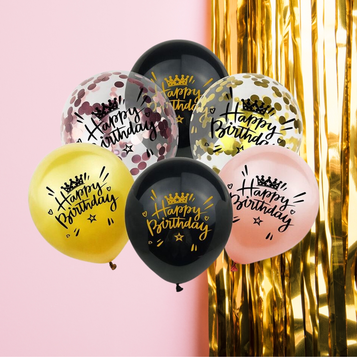 Eleva la alegría de tus celebraciones con nuestro Set de Globos de Cumpleaños. Con 6 globos R12 o 30 cm, este conjunto presenta un diseño encantador de Happy Birthday en colores negro, dorado y rose gold. Los globos confeti y de látex añaden un toque festivo y dinámico a la decoración. Este conjunto es perfecto para realzar cualquier espacio, desde fiestas en casa hasta eventos en salones. Deja que estos globos capturen la esencia de la ocasión y añadan un toque de elegancia y diversión a tu celebración. Crea momentos inolvidables y decora con estilo con este set de globos de cumpleaños.