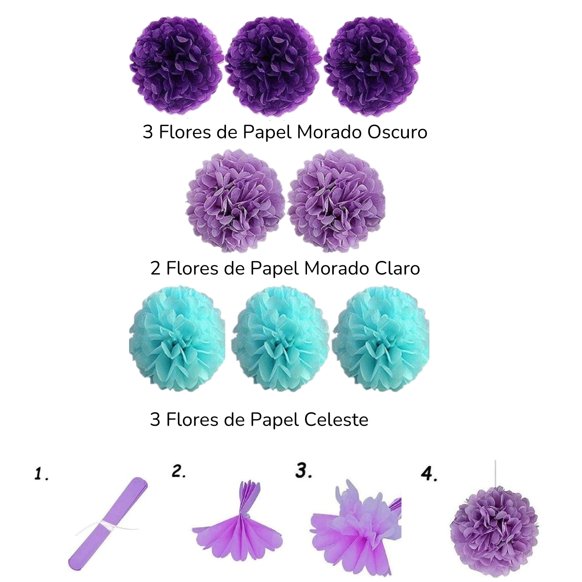 – 8 Flores Papel (3 Morado oscuro, 3 Celeste y 2 Morado Claro)